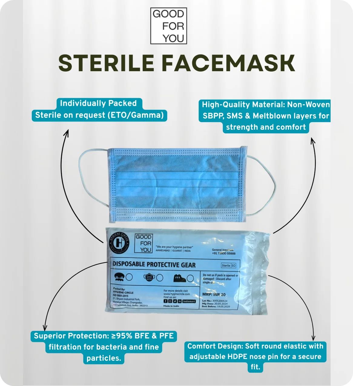 Made from Non-Woven Polypropylene (SBPP) Fabric, SMS and Meltblown for durability and comfort.